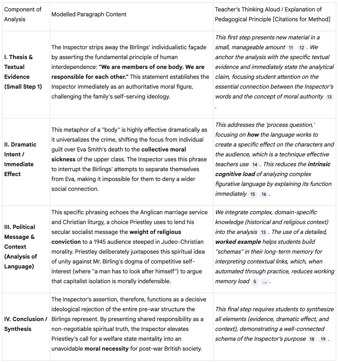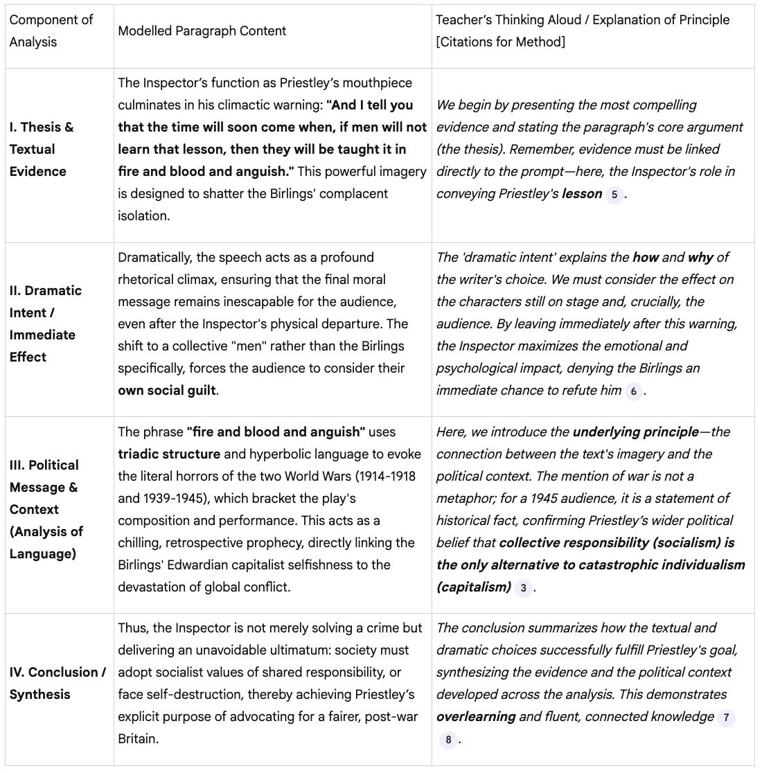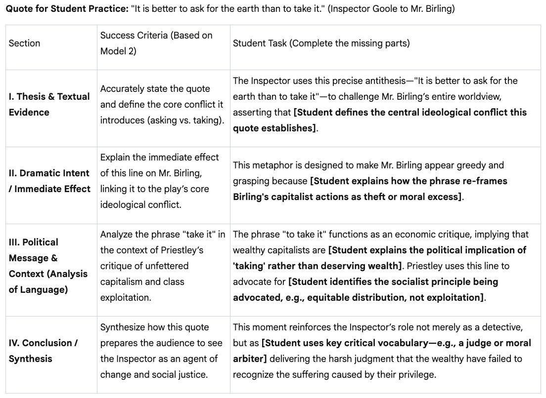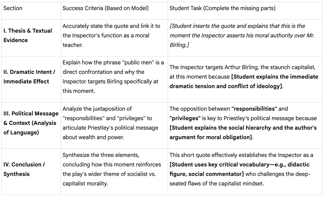 This worked example models how a student should structure a detailed paragraph that integrates textual evidence, dramatic intent, and Priestley’s political message regarding the Inspector’s final, pivotal speech.